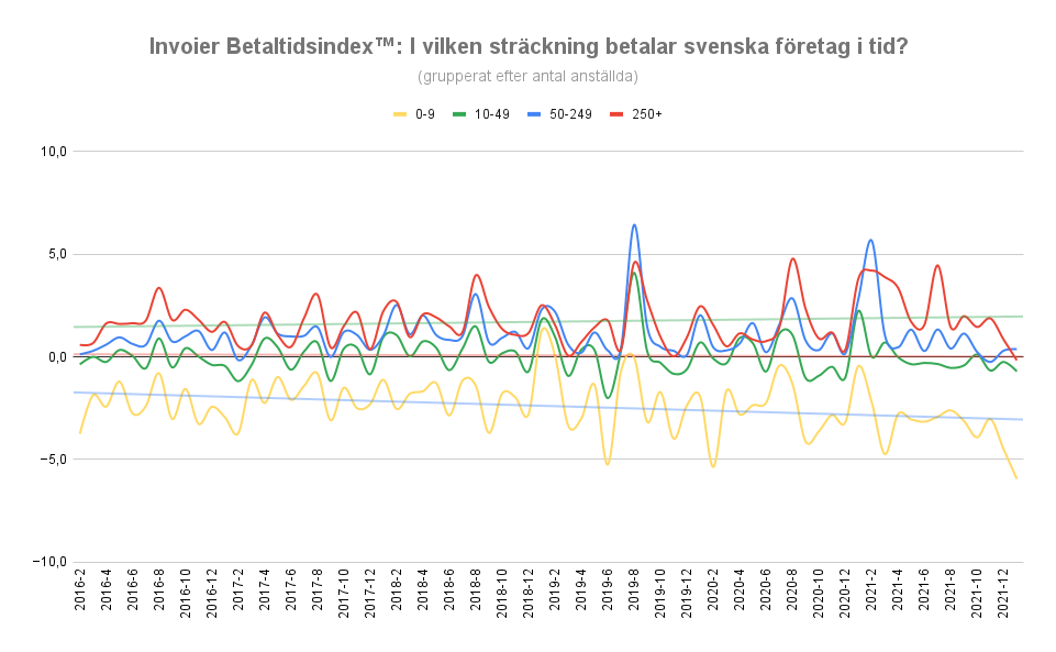 Fintechbolaget Invoiers Betaltidsindex™ visar att augusti är den månad när större företag i ännu högre utsträckning är sena med sina betalningar. I genomsnitt betalas varje faktura från storföretag i Sverige under augusti månad 3,5 dagar sent, något som kan få stora negativa effekter för små- och medelstora företag med storföretag som kunder. Trenden återkommer årligen sedan 2016, när indexet börjar mäta.